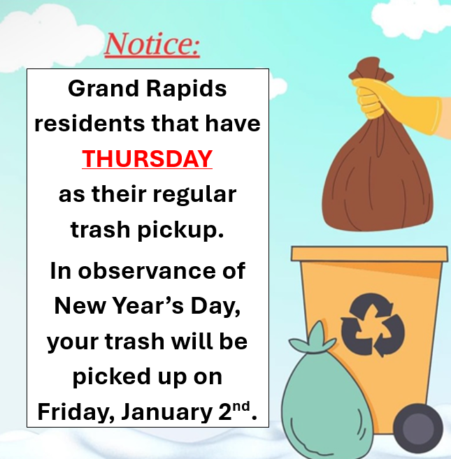 In observance of New Year’s Day, your trash will be picked up on Friday, January 2nd.
