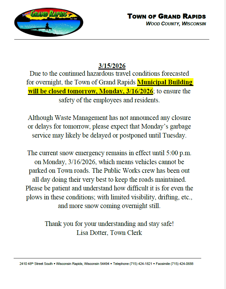 Due to the continued hazardous travel conditions forecasted for overnight, the Town of Grand Rapids Municipal Building will be closed tomorrow, Monday, 3/16/2026; to ensure the safety of the employees and residents.
