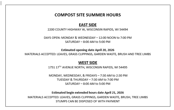 MATERIALS ACCEPTED: LEAVES, GRASS CLIPPINGS, GARDEN WASTE, BRUSH, TREE LIMBS STUMPS CAN BE DISPOSED