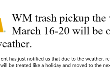 WM trash pickup the week of March 16-20 will be off a day due to…