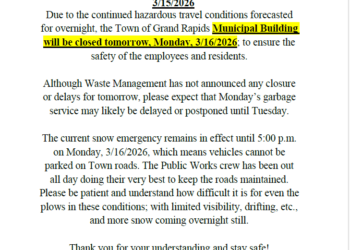 3/15/2026 Due to the continued hazardous travel conditions forecasted for overnight, the Town of Grand…
