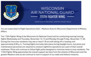 The 115th Fighter Wing of the Wisconsin Air National Guard will be conducting evening training…